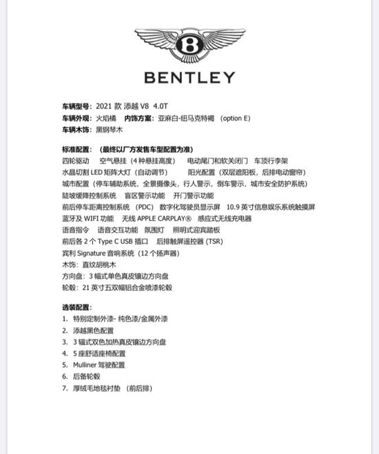 配置:特别定制外漆,添越 (配置|询价)黑色配置,3幅式双色加热真皮镶边方向盘,5座舒适座椅配置,Mulliner驾驶配置,后备轮毂,厚绒毛地毯衬垫(前后排)。
