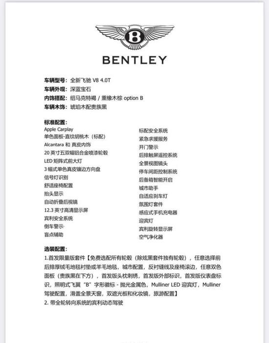 首发限量版套件[免费选配所有轮毂(除炫黑套件独有轮毂),任意选择前后排厚绒毛地毯衬垫或羊毛地毯,城市配置,反衬缝线及座椅滚边,任意双色面板(贵族黑在下方),首发版头枕刺绣,首发版外部标识,首发版仪表盘标识,照明式飞翼“B”字形徽标,-,抛光金属色,Mulliner,LED迎宾灯,Mulliner驾驶配置,滑盖全景天窗,双遮光板和化妆镜,旅游配置],带全轮转向系统的宾利动态驾驶