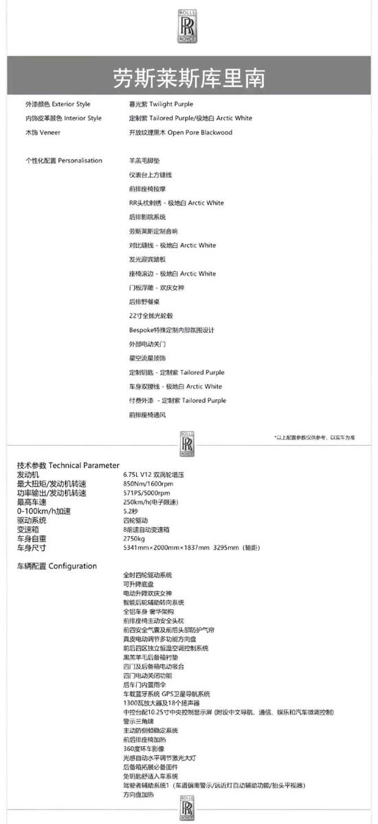 劳斯莱斯库里南前后包围采用了富有层次感的设计,配合恰当的装饰点缀,既美观又避免了古板的感觉,库里南与全新幻影 (配置|询价)共享最新V12动力,放弃了一直以来沿用的自然吸气式V12发动机,转而使用了全新设计的6.75L双涡轮增压V12发动机,和对门的宾利慕尚也同为6.75L。