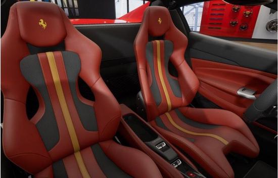 F8上的方向盘,仪表盘和812 Superfast上的是一样的,而空调的出风口改变成了圆形,副驾驶的前面同样有一块7英寸的液晶屏,这是如今法拉利新车的统一设计。家族式样的方向盘不用多说,上面集合了发动机的启动,模式的选择,灯光,雨刷。最吸引驾驶者的就是方向盘后面硕大的换挡拨片,还有方向盘上方的换挡提示灯。 座椅还是那套法拉利常用的运动座椅,如果要选配碳纤维赛车座椅,一套价格是10万,选配全电动座椅是77000人民币。
