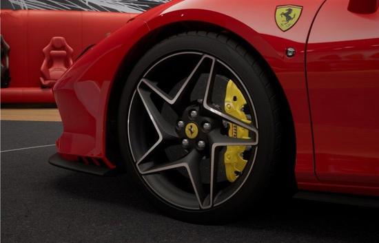 F8的车身尺寸为长4.611米,宽1.979米,高1.206米,和488GTB相比,车身长度和高度都要更大,但是要更低矮一些。侧面的设计主要考虑了为发动机提供充足的冷却气流,F8上面的散热器布局和488 Pista一样,都是向着车辆尾部倾斜,给车身底部散热。再看看它所匹配的轮毂,这种非对称设计的锻造轮毂非常运动,但它却是选配件。