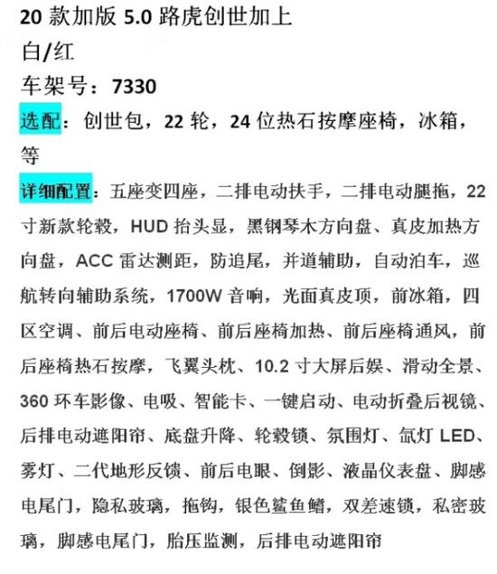 2020款加版路虎揽胜 (配置|询价)5.0加长创世 恒时四驱系统备有攀爬所必须的低速挡,还有专用来安全下坡的HDC陡坡缓降系统。四探头式泊车雷达和自动泊车系统也是为您降低驾驶难度所准备的。车内配有多媒体DVD音效系统,让您置身车内尽可享受舒适奢华的贵宾式待遇,路虎揽胜5.0创世加长SV版将以王者风采续写天下奢华SUV永恒的经典,引领世人揽无上胜境。选材是其上风地点,出现的内饰气势派头优雅风雅 ,而选配的后排双座行政座椅则带来更为至臻的乘坐享受。