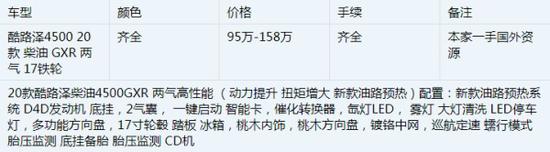 全新兰德酷路泽(陆地巡洋舰)丰田酷路泽4500技术参数:排气量:4461CC、车辆型号:VDJ200L-GNTNZV、变速箱:6速自动挡、发动机:8缸/双涡轮/32V双涡轮增压冷却器(D4D)、最大功率:232HP/3200RPM、最大扭矩:62.7KgM/1800-2200RPM。