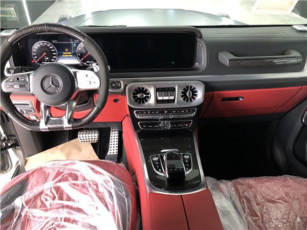 20款奔驰G63内饰极具奢华,真皮内饰搭配AMG碳纤维内饰,现代感十足,Nappa真皮AMG多功能运动方向盘,手感和操控性都非常出色,还带有加热功能,中控区连屏的设计,为整个内饰的科技感带来升级,大屏下方,是双涡轮造型的空调出风口和奔驰经典的三把差速锁,车内还配备了6 4色的氛围灯、柏林之声的3D音响、全季脚垫等细节的配置,为你带来非凡的乘坐体验。
