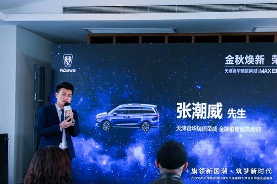 天津君华瑞信4S店内训师,在活动现场为到场嘉宾解读作为国潮座驾典范的代表,荣威iMAX8一见倾心的高颜值设计;随后天津君华瑞信4S店销售经理登台,公示活动当日大客户优惠政策。