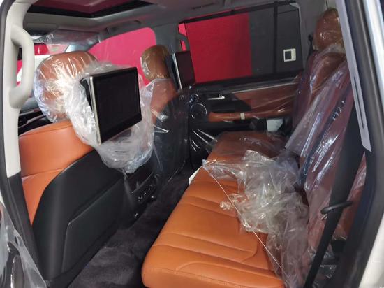 两块安装于前排座椅头枕的11.6英寸液晶显示屏,为第二排乘客提供私人影院级的观赏效果。后排座椅同样采用半苯胺皮革包裹,座椅的设计较为平坦,不过却宽大舒适,并且支持电动调节前后。后排中央扶手填充厚实,手感也极为舒适,后排分区独立空调控制按键位于扶手前端,也便于操作。后方的盖板打开后可看到多媒体遥控器,可对前排座椅后方的11.6英寸显示屏进行控制,营造出一个豪华舒适的空间。