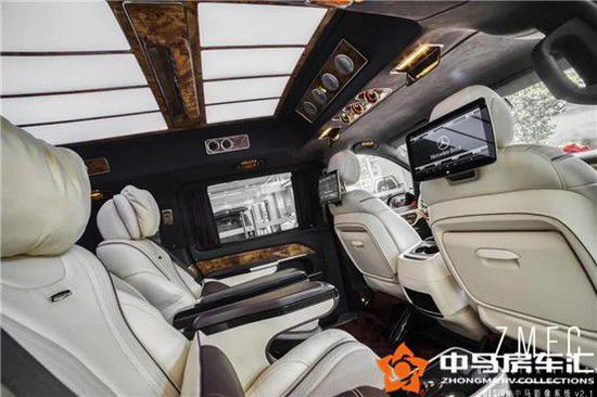 奔驰圣母峰整车采用了后电动双门7座的布局设计。双电动侧滑门代表着尊贵,缓缓进入第二排,头等舱座椅早已落位,深色的羊绒地毯和电动隐私窗帘彼此呼应。