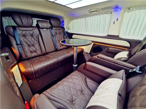 20款奔驰威霆商务车后舱第三排座椅,选用三连座沙发规划一键成床的规划快速成为一张舒适的大床,可拆卸的桌板使得后舱能够快速改变成一个私密的会议空间使得私密会议愈加完美,即便是在路上也能应对各种商战中的突发状况。