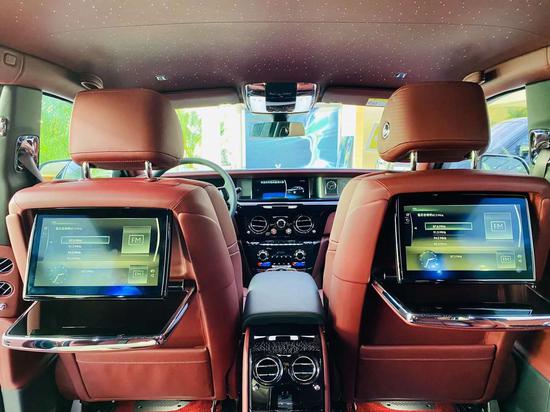 电动折叠板和后排影院系统被巧妙的隐藏在前排座椅的椅背后,只需轻触按钮,便可以自如收放桌板和影院系统,带来完美的剧院体验。后排中央固定扶手做了重点优化,其中国可容纳带有威士忌酒具的酒柜、香槟酒具和冷藏箱,方便乘客畅快交谈,后排座椅角度可以任意调节,这一设计让客户无需转头便可视线自如交流。整个车厢内饰全部以最精美的高档材料装饰,使车内极具触感。