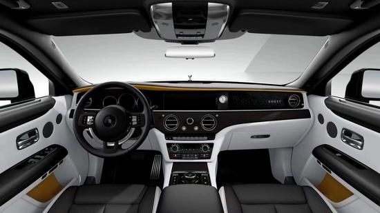 劳斯莱斯古斯特仪表盘,中控屏与副驾前方星光饰板形成贯穿式设计。副驾驶前方的面板配备了星光面板。当车辆启动时,由850颗“星星”围成的“幽灵”车名面板会一起亮起。搭配“星空顶”,极具梦幻感,给你极致的奢华优雅体验。