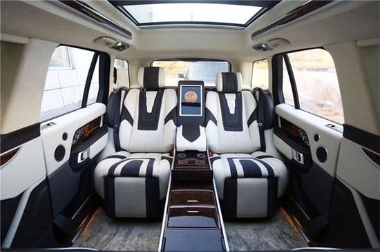 路虎皇家一号加长版贵宾区双行政座椅多向电动调节,带按摩、加热、通风等功能,车顶以及车门装饰版全部为欧洲顶级小牛皮包裹,纯手工精心制作而成的高级地毯,后排配备有鞋托,特殊定制的LED氛围灯、及按钮控制系统,让您置身车内尽可享受舒适奢华的贵宾式待遇!