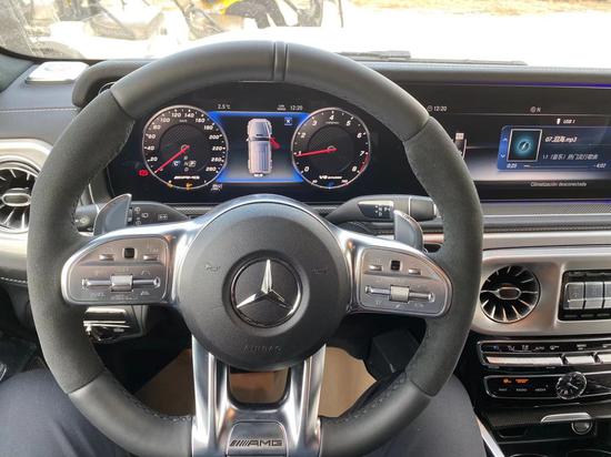 全新G63内饰方面,新G63保留了新G500的整体设计,除配色差异外,新车还换装了全新造型的平底式AMG运动方向盘,其两侧配以打孔皮质包裹,下部镀铬装饰的造型也与新G 500明显不同,看上去十分战斗。此外,全液晶仪表盘+中控大屏的双12.3英寸屏幕设计在新车上也没有缺席,营造出了浓郁的科技感。