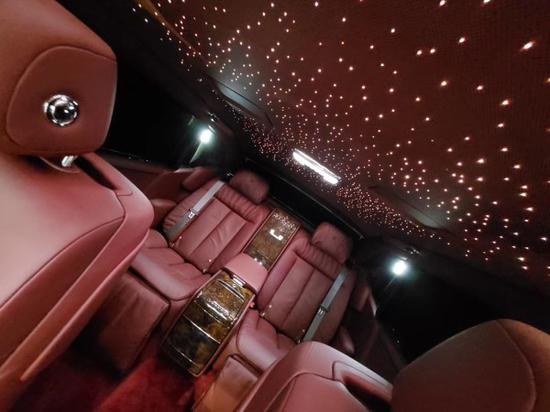 劳斯莱斯幻影举世闻名的星光饰顶抬头可见,整个车厢内饰全部以最精美的高档材料装饰,使车内极具触感。车内采用的皮革隐隐地散发着牛的气味,在幻影车上,公众还能看到最高水准的手艺和最优质的材料。