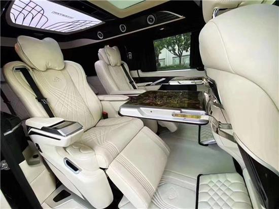 奔驰V260L改装迈巴赫VS680高顶无隔断七座,后排三座采用的是电动三连坐沙发座椅,支持电动一键平躺,座椅变大床只需要一秒。后舱为了照顾到家庭用车居多,没有像全隔断设计那样较好的私密性,V260设计了电动遮光窗帘,让整个空间能够不被外界轻易看到。这款车就是后舱二座的座椅可以旋转,这样后·就能很便捷的形成一个·商务谈判模式。