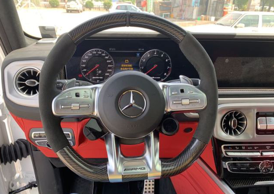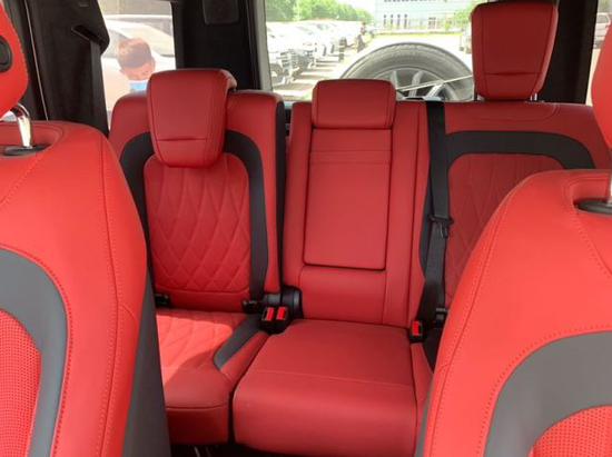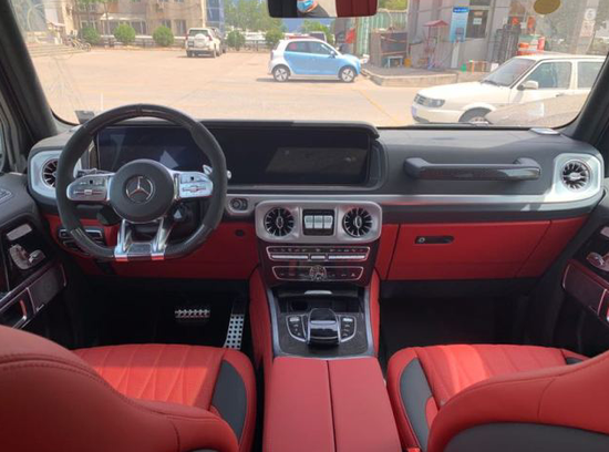 20款奔驰G63 (配置|询价)AMG档次、质感和科技配置都明显提升全新奔驰G级 (配置|询价)的内饰相比老款有了明显的提升,采用了奔驰最新的双屏幕式设计,全液晶仪表盘和中控台屏幕都达到12.3英寸,同时内饰质感和工艺都有了很大的进步。中控涡扇式空调出风口也颇具设计感,车内的高档皮革内饰以及标有V12钻石图案设计的座椅、车门面板和脚垫,无不彰显着车主的尊贵身份。