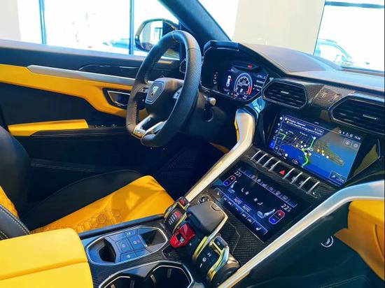 兰博基尼Urus车内有3块屏幕,全液晶仪表盘之外,中控给了上下两块屏幕,和刚发布会的新一代A8一致。皮质和Alcantara材质组合给了它绝佳的视觉效果和手感,中控点火按键上的“红盖头”则延续了兰博基尼传统,让你有一种启动的。