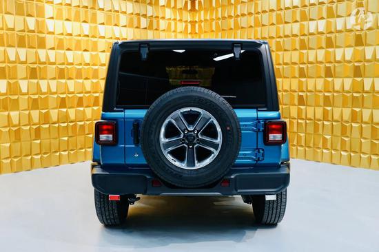 外观:蓝色可拆卸硬顶 黑色门把手 雾灯 车身同色中网 深色防紫外线车窗电动调节带加热后视镜 10周年黑色前后保险杠 RUBICON贴花 运动丝绒座椅带RUBICON刺绣 红色拖钩 黑色油箱盖 全尺寸备胎 真皮红线多功能方向盘,前脸格栅采用经典的七孔折痕设计,看上去更精致,而不乏力量感,前大灯呈双圆形设计,LED日间行车灯移到了两侧的轮供上面,前雾灯集成在前保险杠两侧。