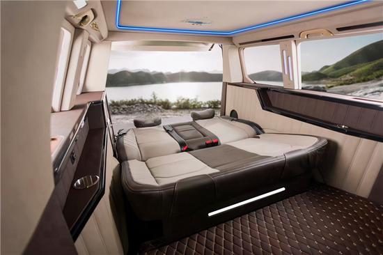 全车真皮包裹,下铺进口柚木地板,福特勇猛者独创半隔断式布局,充分使用车内空间,一起还增加了升降电视及多功能吧台等规划。后排沙发床可独立放倒,前后移动可让后备箱空间灵活使用。前后双天窗的规划更显层次。