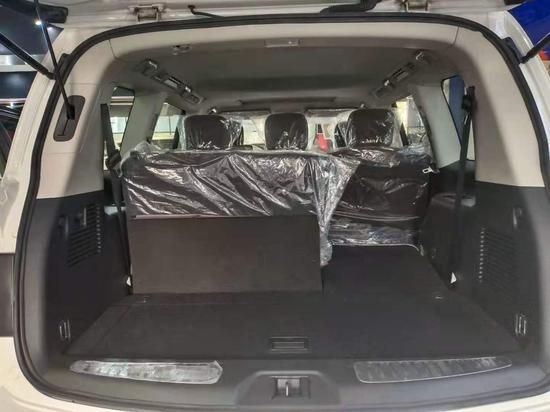 看一下侧面,5315*1995*1940mm的长宽高尺寸,让它的压迫感比陆巡还要强,总有一种不怒自威的感觉。侧面配置了电动调节后视镜,带转向灯和水坑灯,底部是18寸的多幅铝合金轮毂,后方带脚踏板,门把手和前翼子板上的通风孔也都用镀铬点缀。