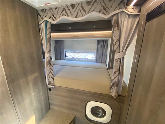 车尾部的拓展仓打开后,尾部的床铺可以从单人床变成双人床,该车的床垫采用的是乳胶床垫,舒服性极佳。床铺上方设计了三个储物仓,可以放置一些衣物。两侧和尾部均配有窗户,方便投放和透光。该房车内部各个区域的隐私拉帘配置的也很齐全,不论是额头床还是尾床,都能保障到乘客的隐私。里侧外推窗的上方设计了吊柜,常用的衣物可以随手放置在这里。