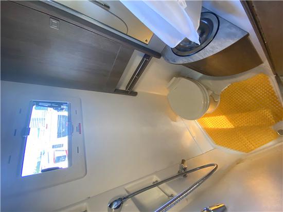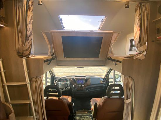 驾驶舱的上方是一个额头床铺,可以同时容纳两个成年人在这里休息。三面均配有窗户,通风和透光效果更好一些。将床板翻折上去可以看到一个32寸的液晶电视。