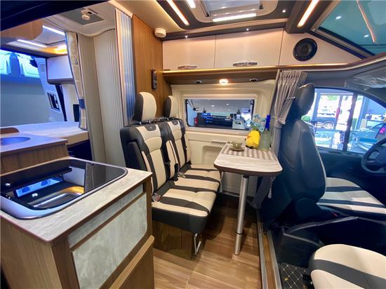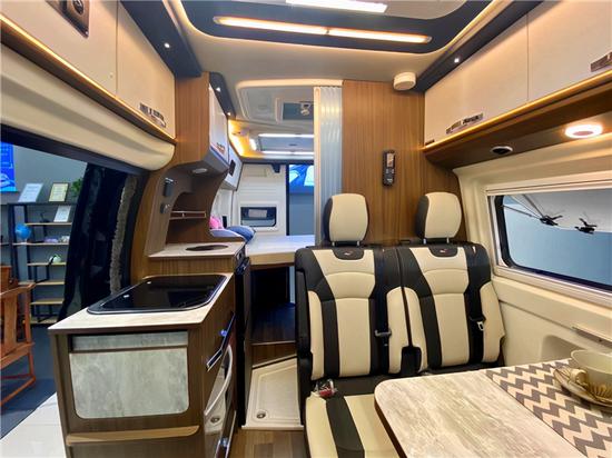 因使用中轴打造,所以此款房车不会像短轴房车那样空间显得局促,这款房车在内部采用EO级环保家具装饰+轻质环保级ABS整车内饰打造,再加上圆润的周边设计与颜色搭配更加的立体,给人一种非常舒适的感官体验。客厅上方是大尺寸外推式全景天窗,可以保证车内通风换气效果。