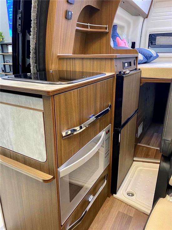 车内厨房配置有85L双开门房车专用冰箱(22L独立冷冻室)、翻折式扩展台面、平板式光波烤箱一体微波炉、镶嵌式电磁炉与翻盖式洗菜池。厨房上部加装有吸顶式厨房专用储物柜。
