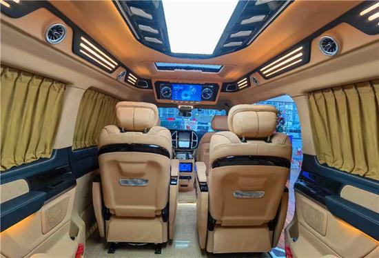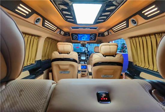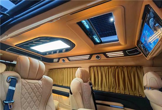 该款车型的设计赋予了该车绝佳的视觉感与空间感,顶部大面积使用几皮绒包覆,视觉上不再像皮革包覆带来的冰冷感受。而内饰整体格局是采用高顶无隔屏设计,节省内部空间让您与家人没有距离感;头等舱按摩座椅,带通风、加热、按摩,比埃尔法座椅更加舒适;一体式冲压钢顶,更加安全;三排座椅中扶手带电控触摸屏;吸顶电视、乘客区独立空调、可开启天窗、实木拼花地板。