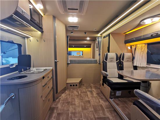 车内采用E0级环保标准房车家具板材,额头床上方的装饰灯组,不规则灯面设计,加上整车暖黄色的灯带设计,整车氛围色彩搭配显得特别温馨。
