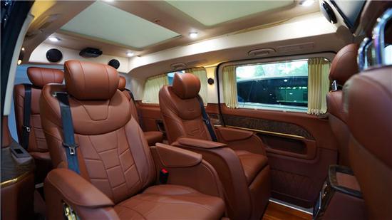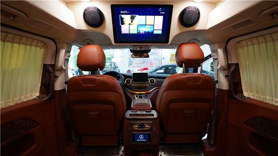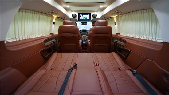 三排三连座椅是非常很人性化的设计因为中排座椅可以向后旋转与后排座椅形成对立状态,后舱的空间完全足够,这样的话和三排可以对坐交谈了;装配上可以拆卸的小桌板,打造一个小型的会议场所。其次这款奔驰七座商务车的第三排是真的不错,空间上翘个二郎腿是完全没有问题的,另外可以通过它的中央扶手箱,可以将座椅慢慢180度平躺,变成一张简约的沙发床。把扶手放下来成两座放上去成三座在您累的时候还可以一件电动放倒成床在上方的睡上一睡都可以;加上两侧隐私窗帘完全放心您车内的私密性,且配有铝合金衣架可以放衣服,可谓非常贴心。