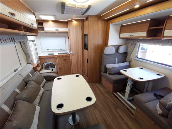 压低卡座沙发与右侧环形沙发的气动升降桌,两组沙发可巧变另外一张单人床铺与双人床铺,尺寸分别为820×1900mm和1200×2100mm,加上前面提到的2人额头床,整车5人休息非常宽松。