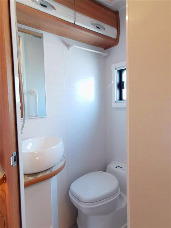 卫生间内配备洗手盆、淋浴头,座便器、毛巾置物架、梳妆镜、换气扇,功能非常齐全,180L超大净水箱,45L灰水箱,自动/手动双排水。功能齐备的一体式卫生间。