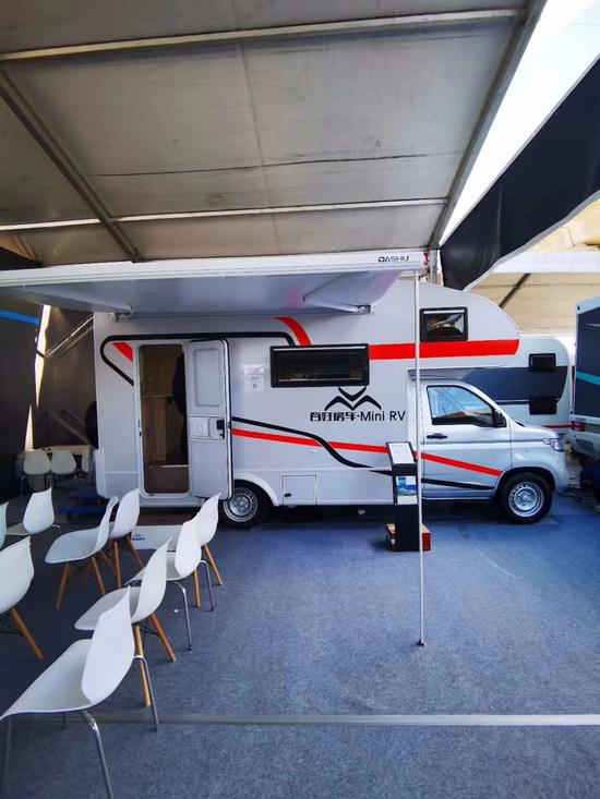 后上门处是房车的厨房区域,厨房区的空间尚可,配备洗漱台、储物柜和热水器,50L的车载冰箱位于另一侧,后期可选装电磁炉、抽油烟机等设施。