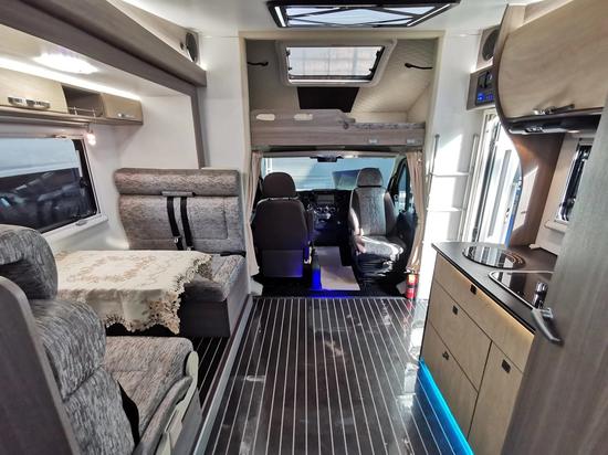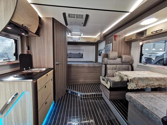 额头床的前方就是我们的拓展仓的空间了,拓展仓的布局是一个对坐双人卡座区域,卡座的中间区域是可升降餐桌,把餐桌降下来可以变成一张可供休息的床,同时在卡座侧面还配有氛围灯。在卡座的后方给此车配备了一款塞特福德110L车载冰箱,以供我们平时的食品保鲜。