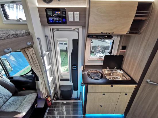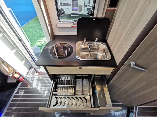 房车厨房配有洗菜池、微波炉、抽油烟机等设施,且厨房板材更加清爽和易于清洁。同时,还配备了电磁炉烟雾报警器,在房车中烹饪更加安全。卡座后方的大容量车载冰箱,节约了空间的同时保持了家具的整体性。