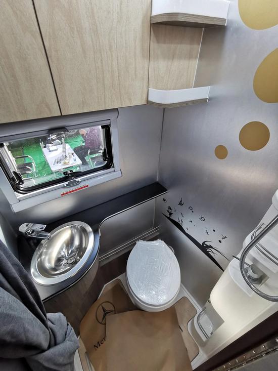 在厨房的后方,就是此车的独立卫浴区域。此车在卫浴区域设立了房车专用坐便器、淋浴花洒、卫生间排风扇、镜子以及毛巾架。为我们的旅行中的洗漱需求提供了很好的帮助。