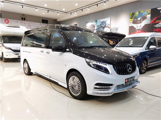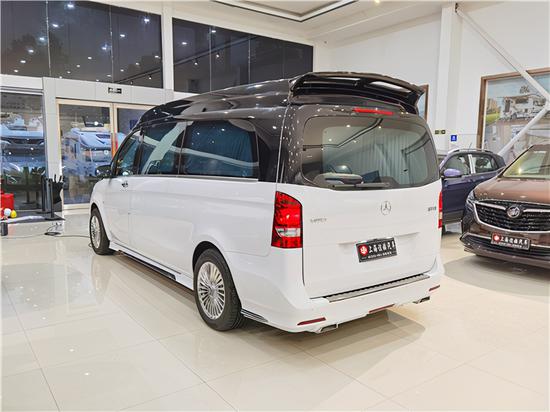 奔驰威霆升级奔驰威霆在外观造型上延续了全新奔驰迈巴赫S级的设计理念, 标志性的子弹头式外观搭配平直的车身线条,稳重大气。保持了V级的整体造型,子弹头的外观和平直的线条构成高端商务车的标准轮廓。外观颜色蓝白双拼色,内饰纯米色。
