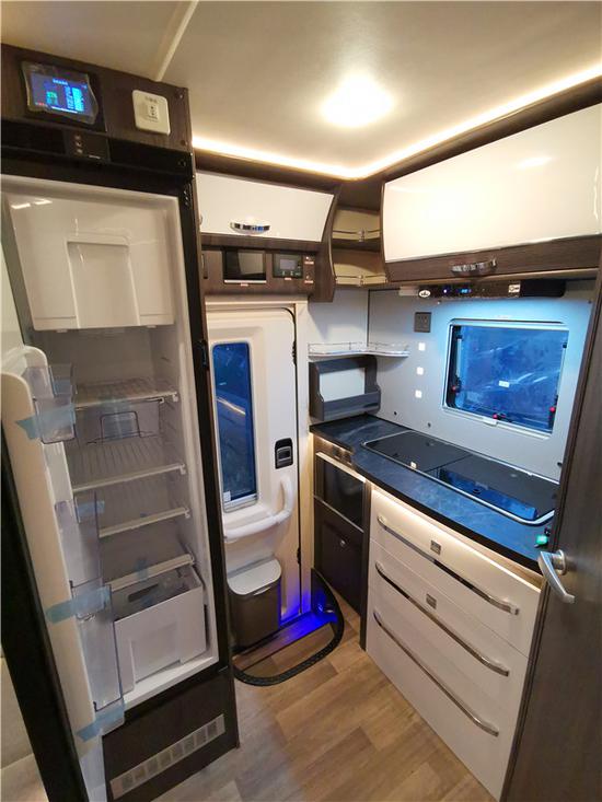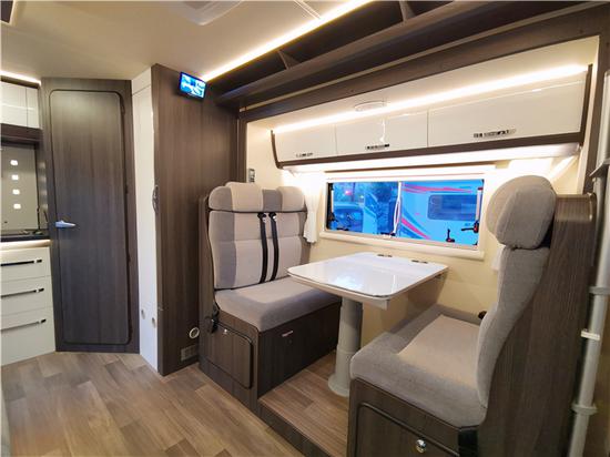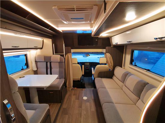 铂驰旅行家单拓展打开侧拓展舱之后,室内的布局纵深感很强,得益于这款车的布局设计,车厢中部一侧是横置沙发,一侧是双人对座式卡座沙发,车后部是卫生间和厨房区,站在车内的两端,怎么看室内空间都足以媲美双拓展。更加重要的是室内的线条和板材的搭配,近似于深空灰的板材色调,白色主色调的家具表面,再搭配浅色的布艺沙发,欧式风格非常明显。