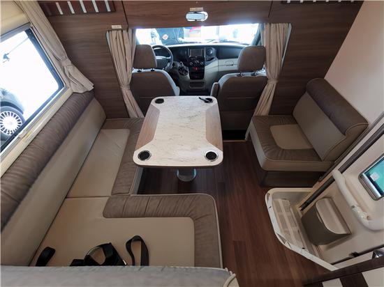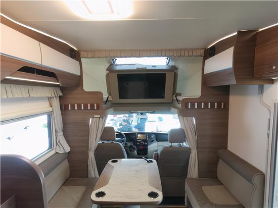来到内饰部分,别看E款的格林卡诺不带有拓展,但是会客区依旧有着足够的大面积,左侧L型一体式沙发,中间为气动式升降桌,右侧是一张单独的座椅,再加上旋转过来的副驾驶,整个会客区俨然变成了家居客厅一般。额头床下方是一台32寸高清液晶电视,再配上双音区播放器、超薄喇叭,客厅再升级家庭影院。