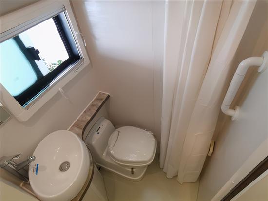 卫生间部分,SMC航空板材一体成型,杜绝发霉漏水。内部配有塞特福德18L可旋转马桶、储物柜、淋浴喷头、洗手台、排气扇等日常常用设施。水箱方面,净水箱180L,灰水箱45L。