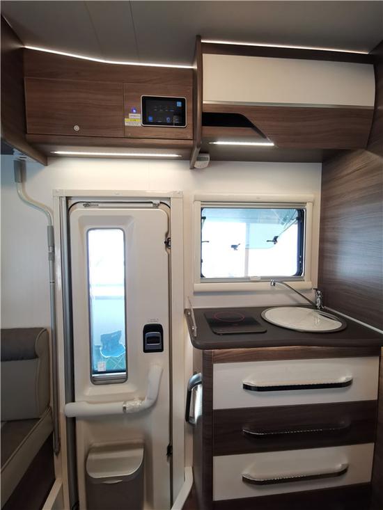 厨房区域功能齐备,区配备电磁炉、盖板洗菜盆、冷热水龙头、英德尔156L冰箱、厨具抽屉、储物柜、厨具收纳袋、水路过滤器、低噪水泵一氧化碳报警器、可燃气体探测器等,特鲁马暖风热水一体机为车内提供热水,暖风。