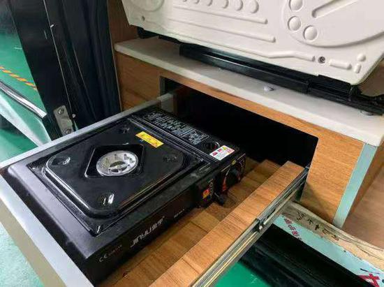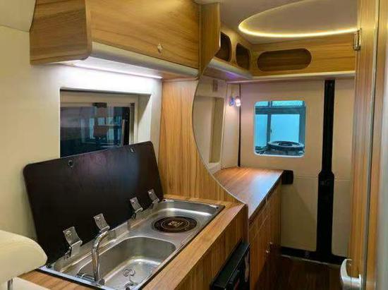 厨房区有冷热水双控洗菜池、电磁炉,抽油烟机、49升冰箱、微波炉、橱柜等设施。即使是在路途中饿了,也能凭借这些设施,做一手可口的饭菜。中门设有双向抽屉和拓展外置厨房小桌板,实用性极高。