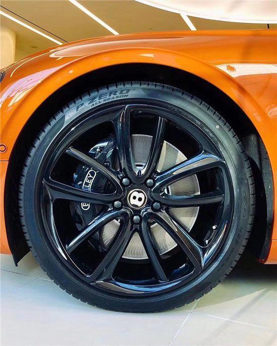 20款欧陆GT全系将标配21英寸轮毂,并提供两种不同造型,也可选择22英寸轻量化锻造轮毂,侧翼子板处有个小的通风口,附有“12”的字样;DBS搭配21英寸“Y”字型轮毂,在前轮拱上有超级夸张的通风口,可以有效地为前刹车散热,下方还有DBS的标识,性能范十足。