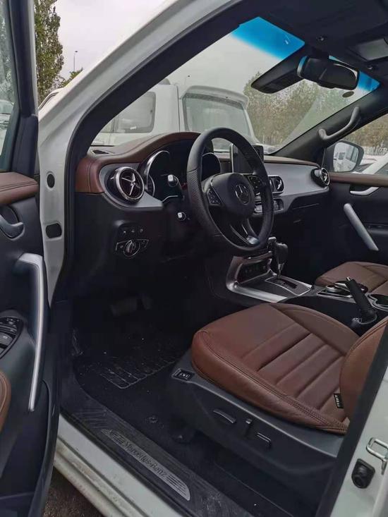 改装版奔驰X级皮卡的外观、内饰变动很多,清亮百搭的白色打底,前脸在保有原版X级的基本风格之外,以黑色炭纤维饰条装饰在中网上方别具一格;车头两侧轮眉向外扩张,搭配冷饰品铆钉修饰,更显不羁。