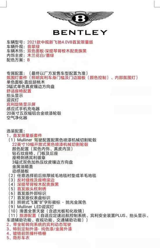 主要配置:1、首发限量版套件;2、带全轮转向系统的宾利动态驾驶;3、特别定制外漆- 纯色漆/金属外漆;4、镀铬前防撞杆格栅;5、隐形车衣。