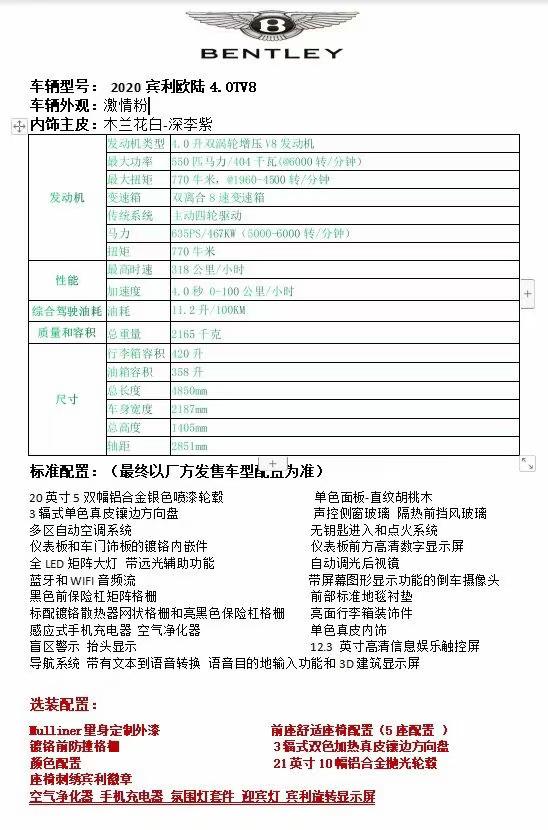 20款宾利欧陆GT W12采用6.0T排量的,642马力,8档手自体一体。车的长宽高是4818.1947.1391。。两门四座硬顶跑车,最高车速 (km/h)332,官方减速(s)4.10 ,轴距(mm)2746,车身容积90L,行李箱容积358L,接纳双涡轮增压W12,最大功率(kw)472,最大功率转速(rpm)5900,最大扭 矩(N.m)840,最大扭矩转速(rpm)2000,接纳的是主动变速箱,驱动方式:全时四驱。