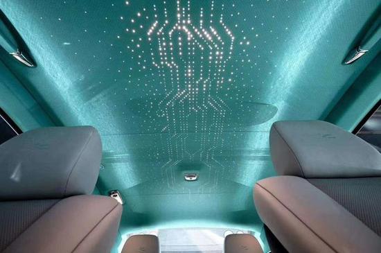 进入车内,劳斯莱斯也为魅影Kryptos Collection版增添了更多“密码”元素来与外观做呼应,其中最为特别的当属与外观相同的青绿色星空车顶,同时光源的布局也采用类似电路的排布,视觉效果不俗。