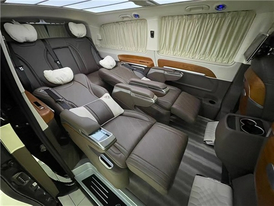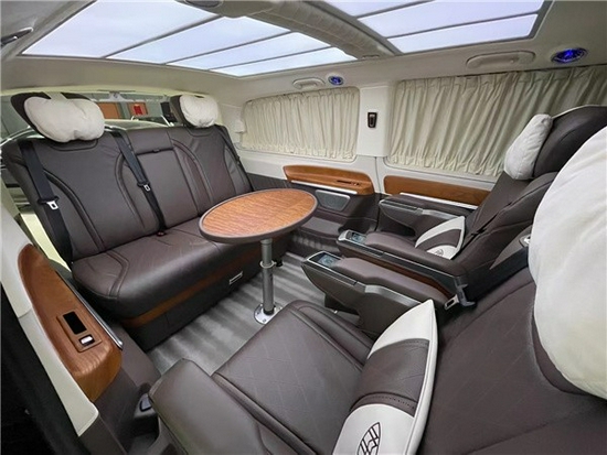 2021款奔驰威霆高顶七座最大的提升在于其贵宾舱的升级。整车采用2+2+3的座椅布局格式,空间一如既往的大,在这里工作,休息,就如在家中般舒适。乘坐感方面的设计理念更贴近生活,第二排采用进口航空座椅的通风、加热、按摩、旋转功能,让您享受最惬意舒适的乘座环境。航空座椅中的扶手可加装触控屏。商务车多种内饰改装方案请来电咨询。