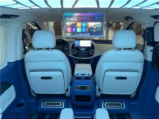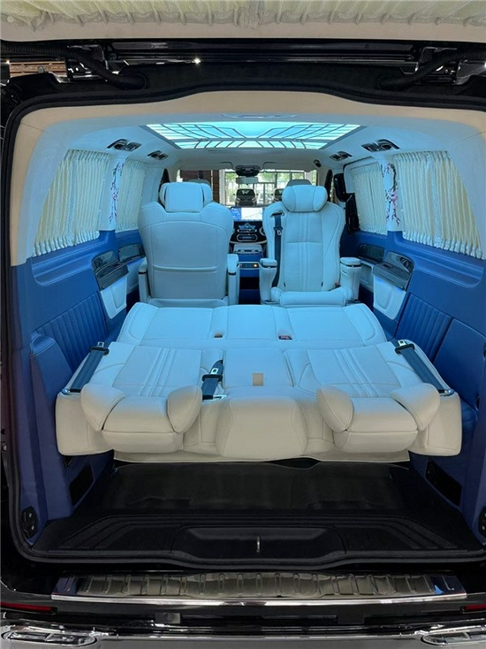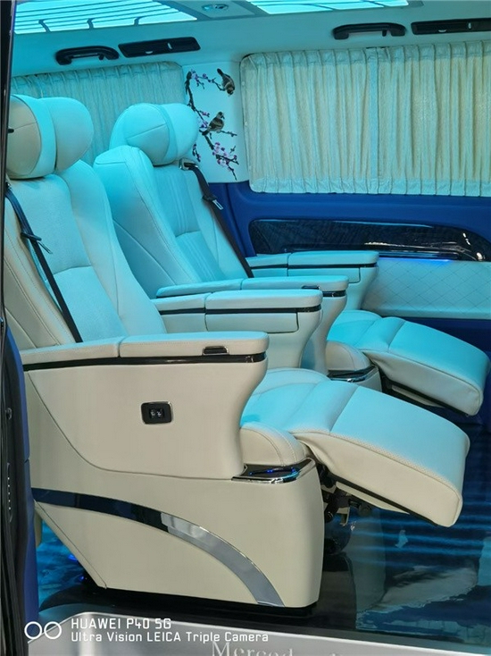 后排三座采用的是电动三连坐沙发座椅,支撑电动一键平躺,座椅变大床只需要一秒。后舱为了照顾到没有像全隔断规划那样较好的私密性,奔驰威霆改装规划了电动遮光窗帘,让整个空间能够不被外界轻易看到。这款车便是后舱二座的座椅能够旋转,这样后·就能很便捷的构成一个·商务谈判的局面。