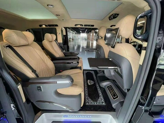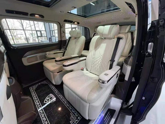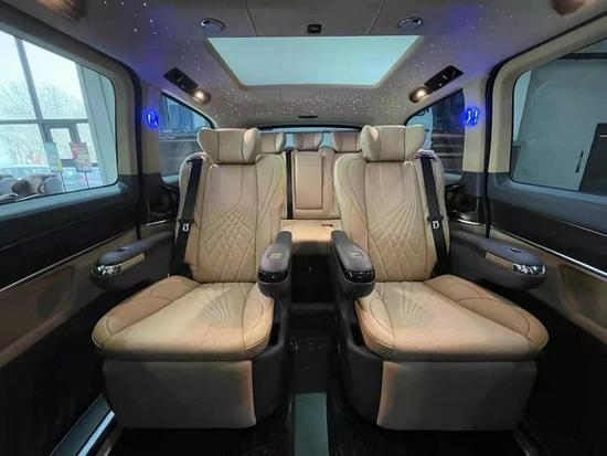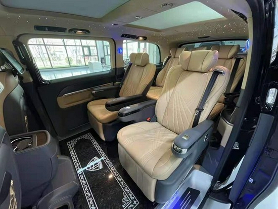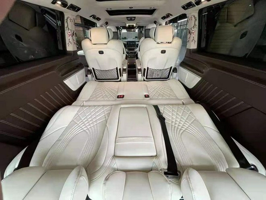奔驰V260无隔断式设计,主副驾驶座椅前方安装有手动小桌板,可承重10公斤,文娱影音配备齐全,吸顶高清液晶电视,需求时可全新奔驰V260商务车前后舱无隔断,电动侧滑门,闭合声音洪亮,还可经过中控台按键多种方式自由操控,全新奔驰V260豪华商务房车为您度身定制VIP专属步入感。乘客舱前排首长级多功用按摩座椅带脚托,设计了滑轨,可自由电动移动和收缩,顺应多种身高、体型的乘客,多种坐姿任君选择,将温馨惬意延伸到车内每个角落。